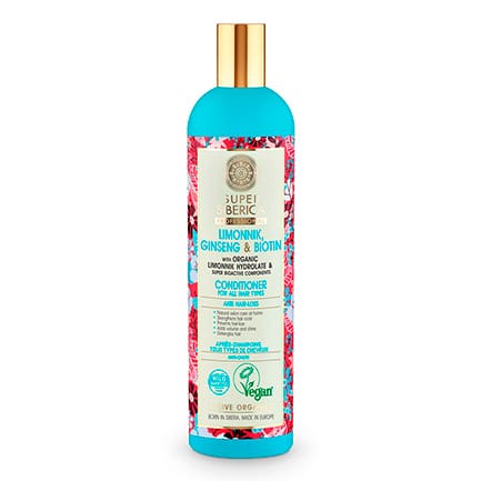 El bálsamo capilar profesional de schizandra, ginseng y biotina, basado en hidrolato de schizandra orgánico, activa el crecimiento del cabello, lo deja más grueso y brillante y facilita el peinado.
