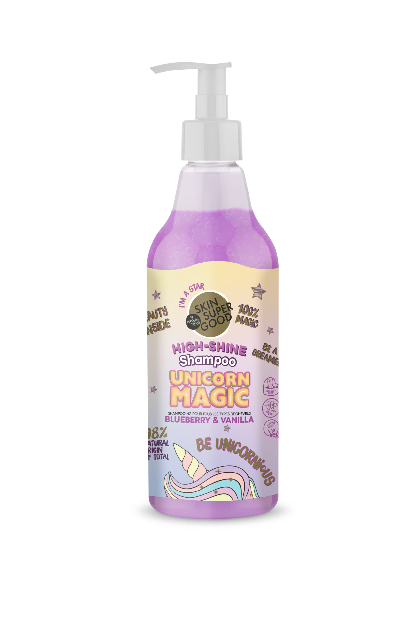 El Champú para un cabello brillante oferece a tu cabello la magia de los extractos de arándano para foralecerlo y de la vainilla para dejarlo suave. Experimenta su poder transformador mientras tu cabello brilla con la luminosidad de un unicornio y se siente irresistiblemente sedoso. Revitaliza tu cabello con la generosidad de la naturaleza, dejándolo brillante y encantadoramente suave. Descubre la magia en cada lavado