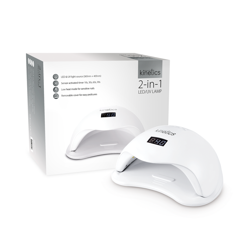 LÁMPARA LED PRO La lámpara Kinetics 2-en-1 LED/UV para uso profesional tiene un temporizador sensoractivado con modo de bajo calor adicional para uñas sensibles, que es perfecto para evitar quemarse. Temporizador del sensor tiene función de memoria presione el tiempo elegido durante 2 seg., y la lámpara lo recordará. La cubierta extraíble es perfecta para pedicuras. *Fuente de luz LED/UV *Temporizador activado por sensor *Modo de bajo calor para uñas sensibles *Cubierta desmontable para pedicuras fáciles.